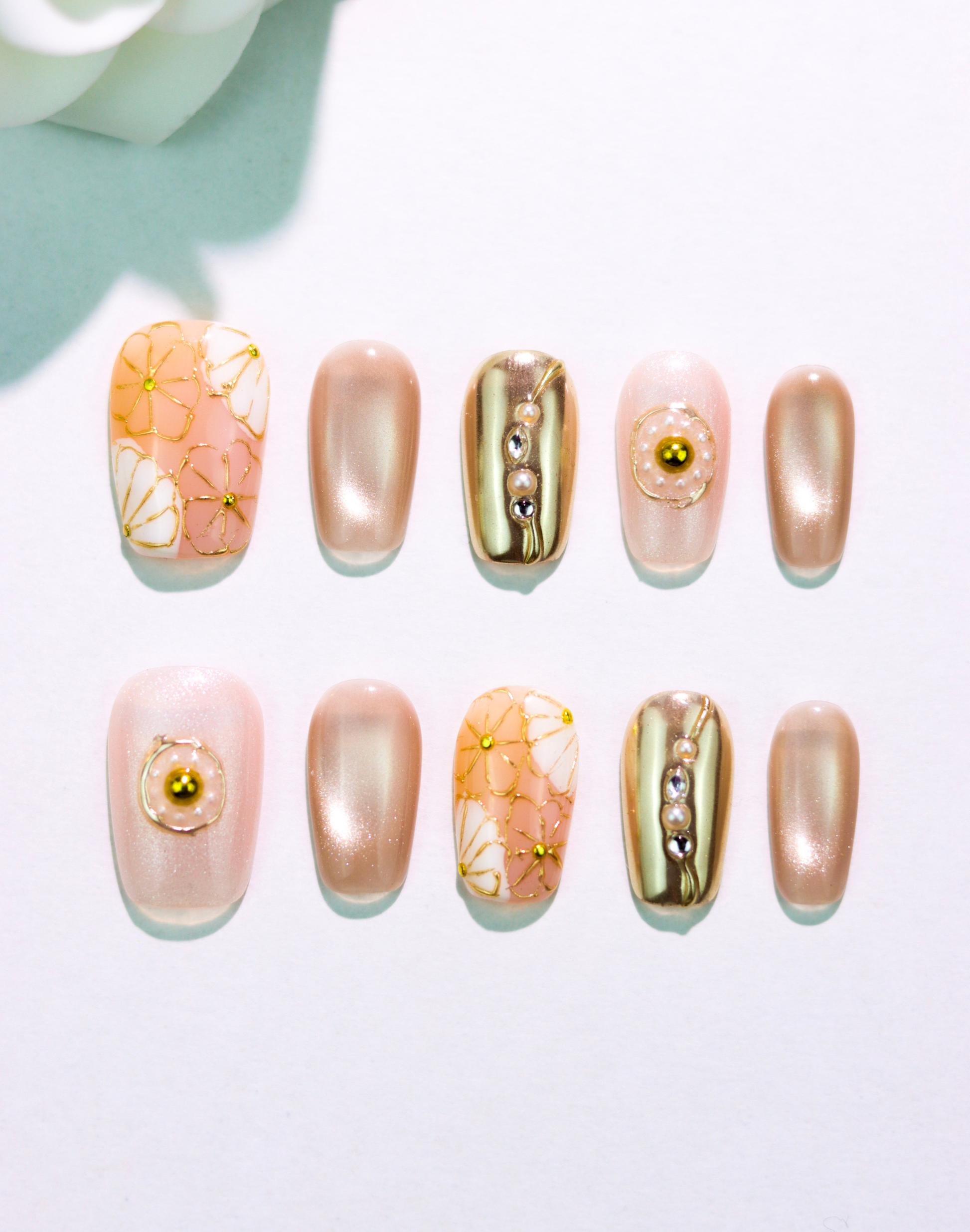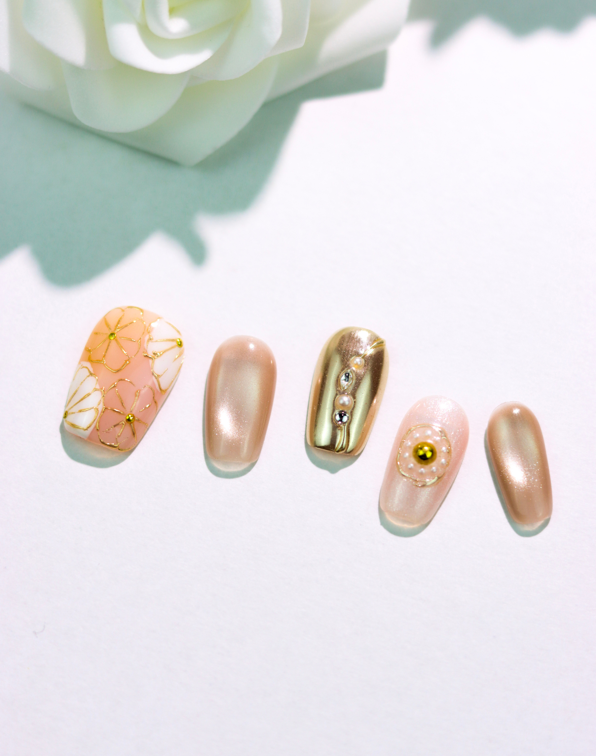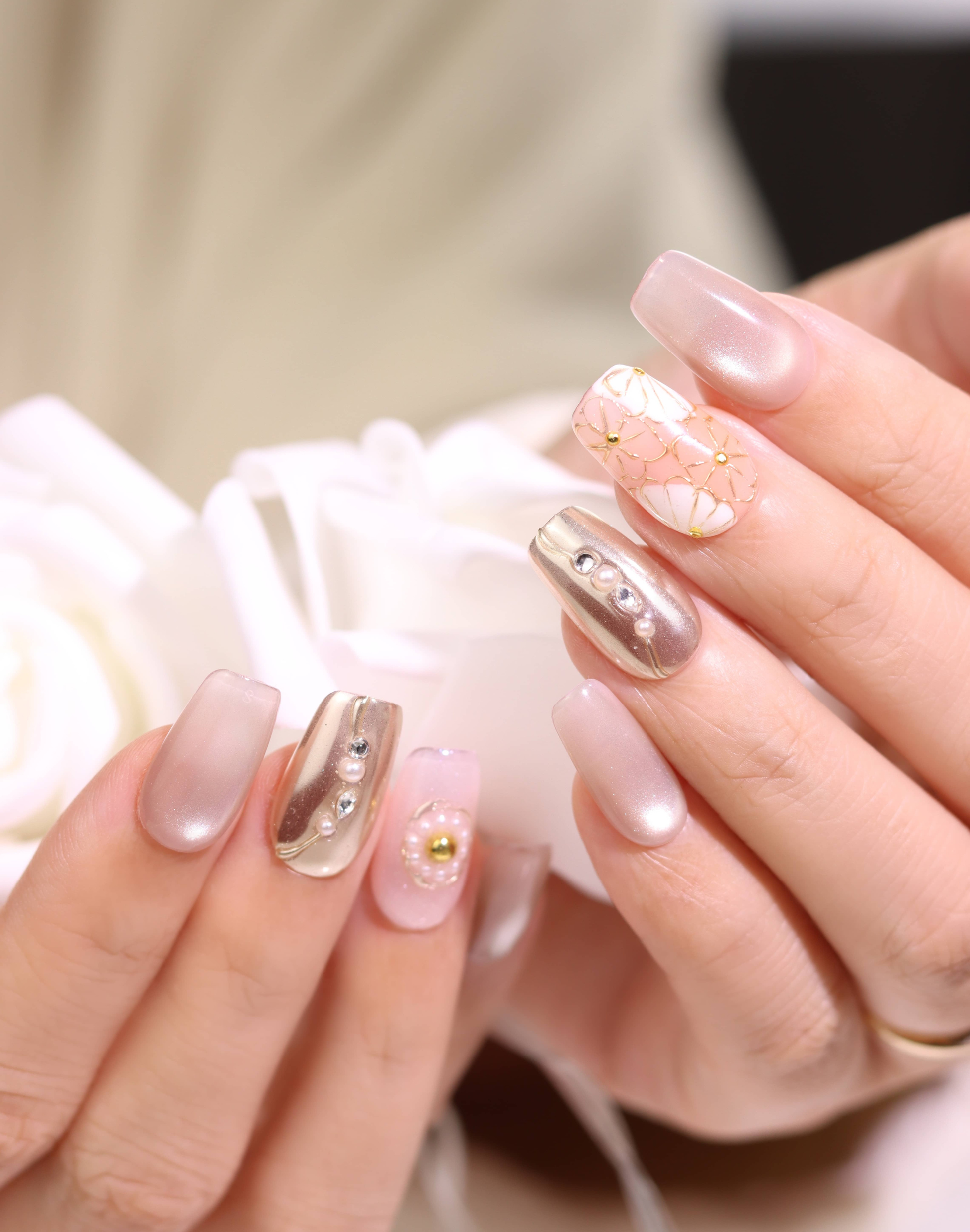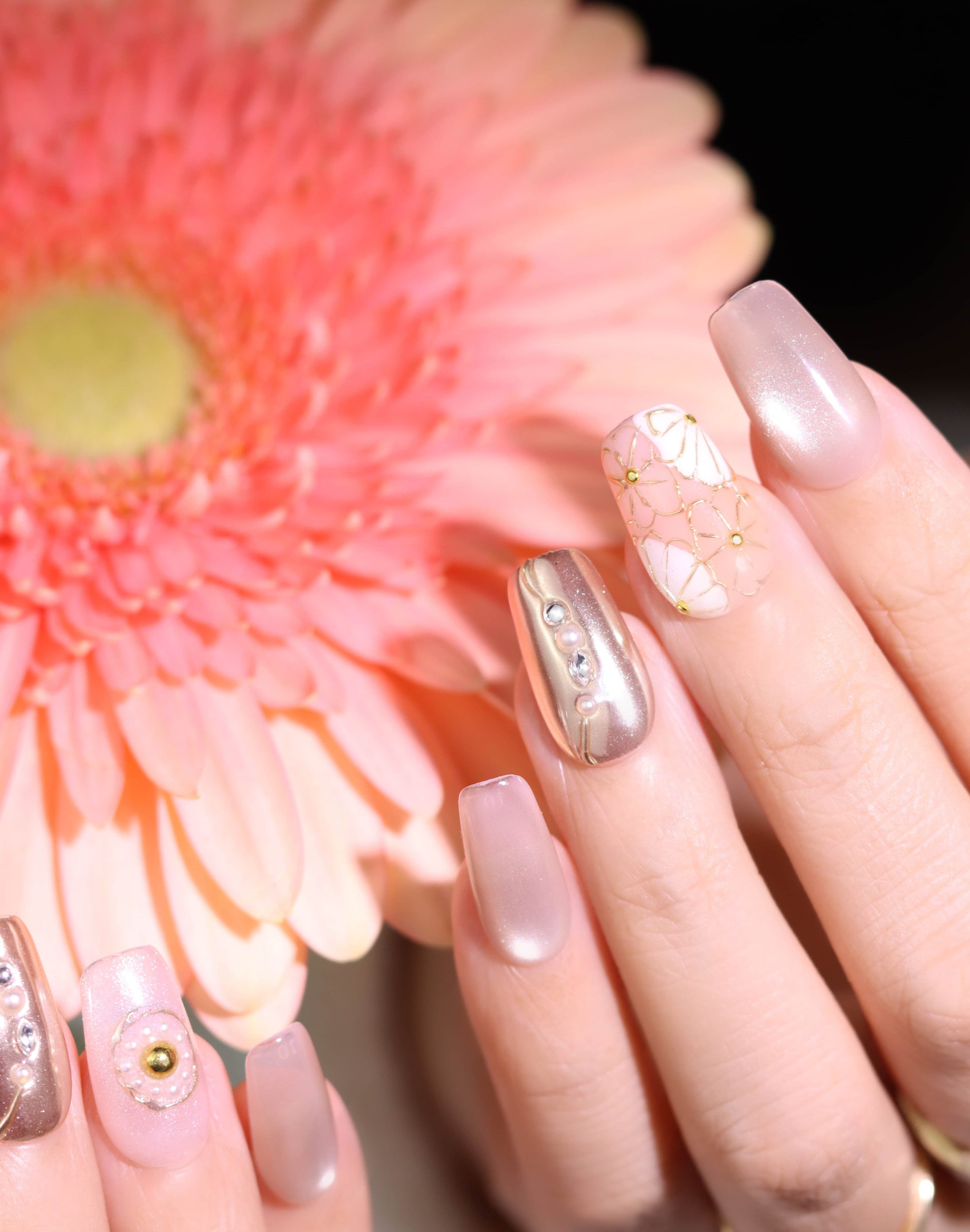 やわらかなヌーディーベージュをベースに、繊細なゴールドラインで描いたフラワーモチーフを重ねたネイルチップです。