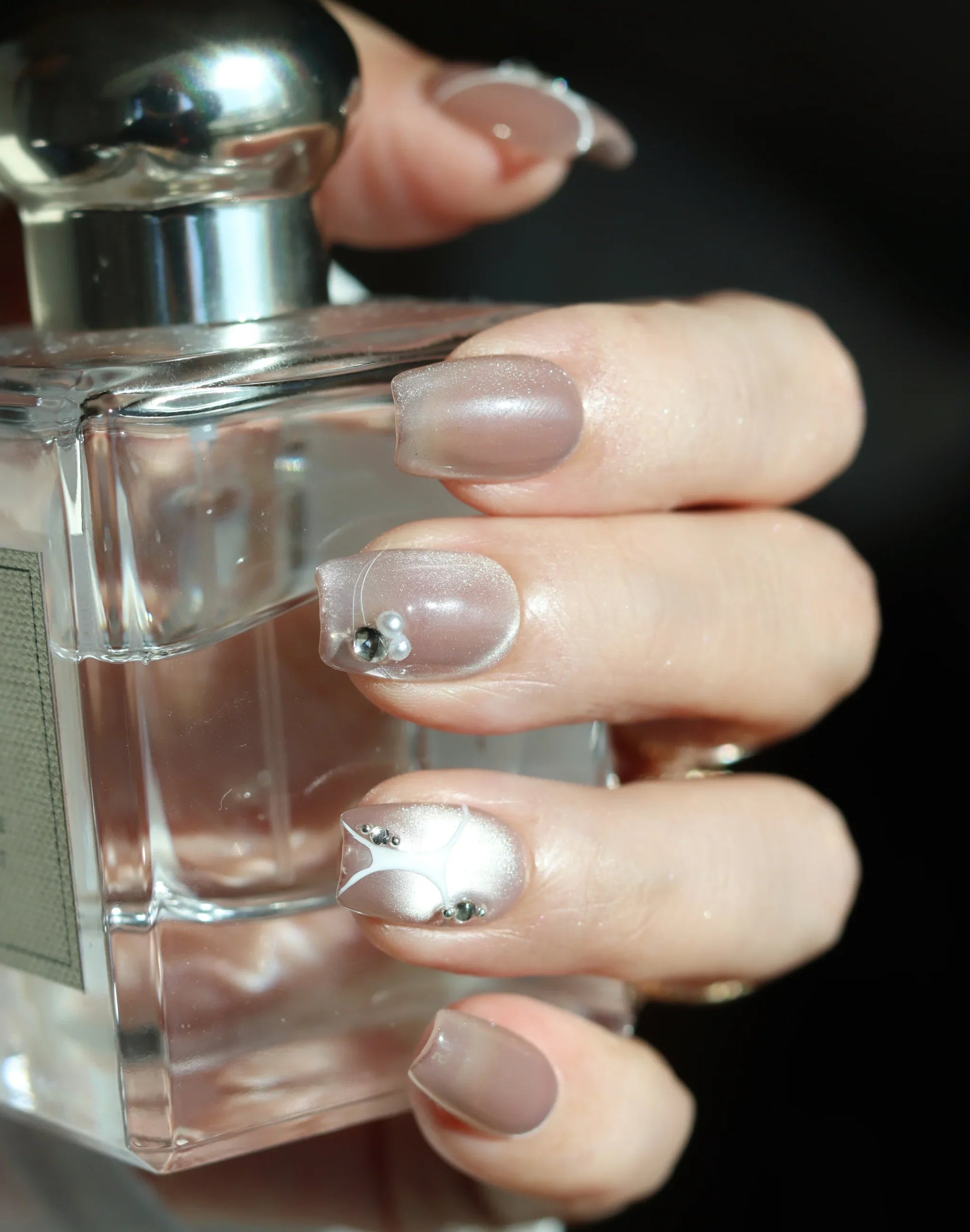 表面に描かれた流れるようなラインと、さりげなく添えたビジューがアクセントとなり、