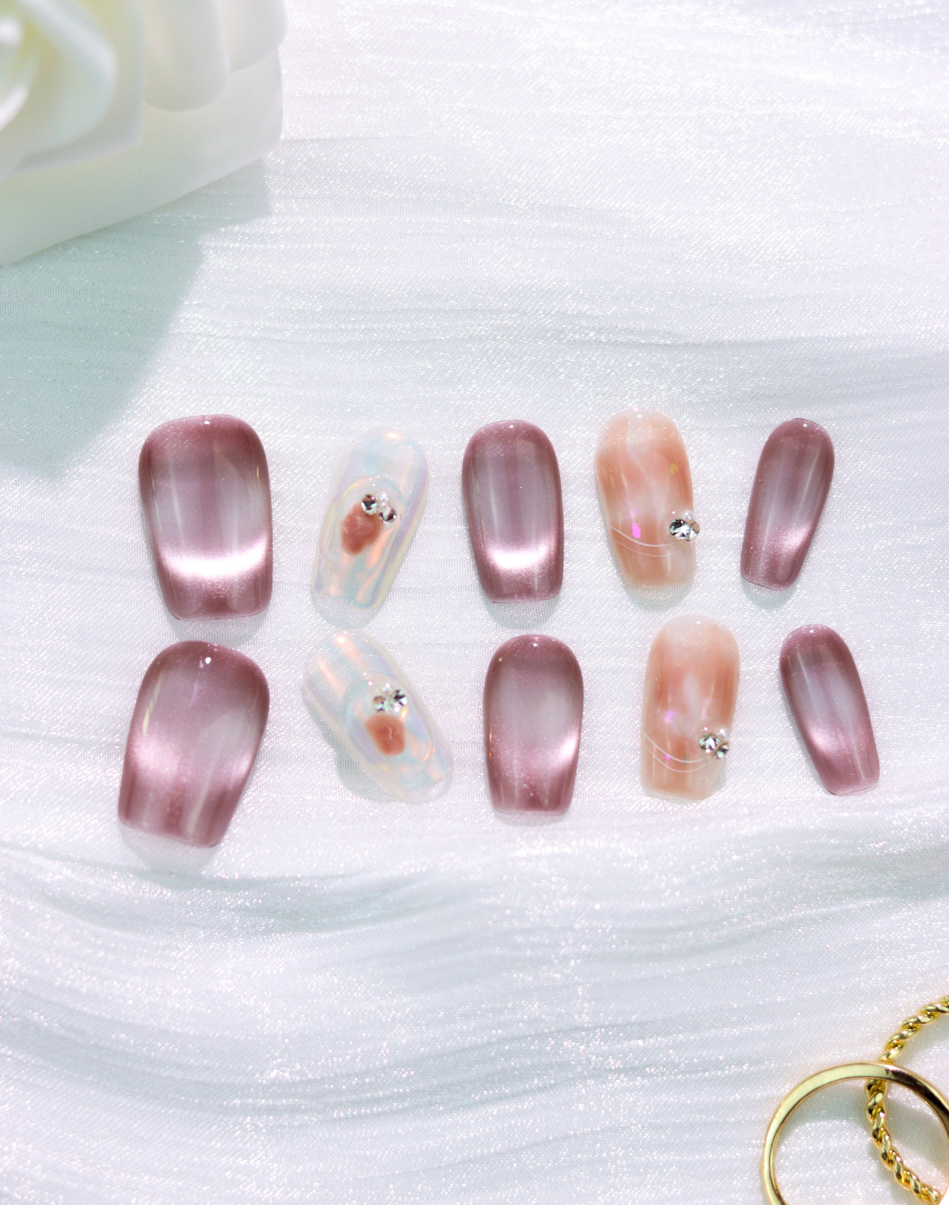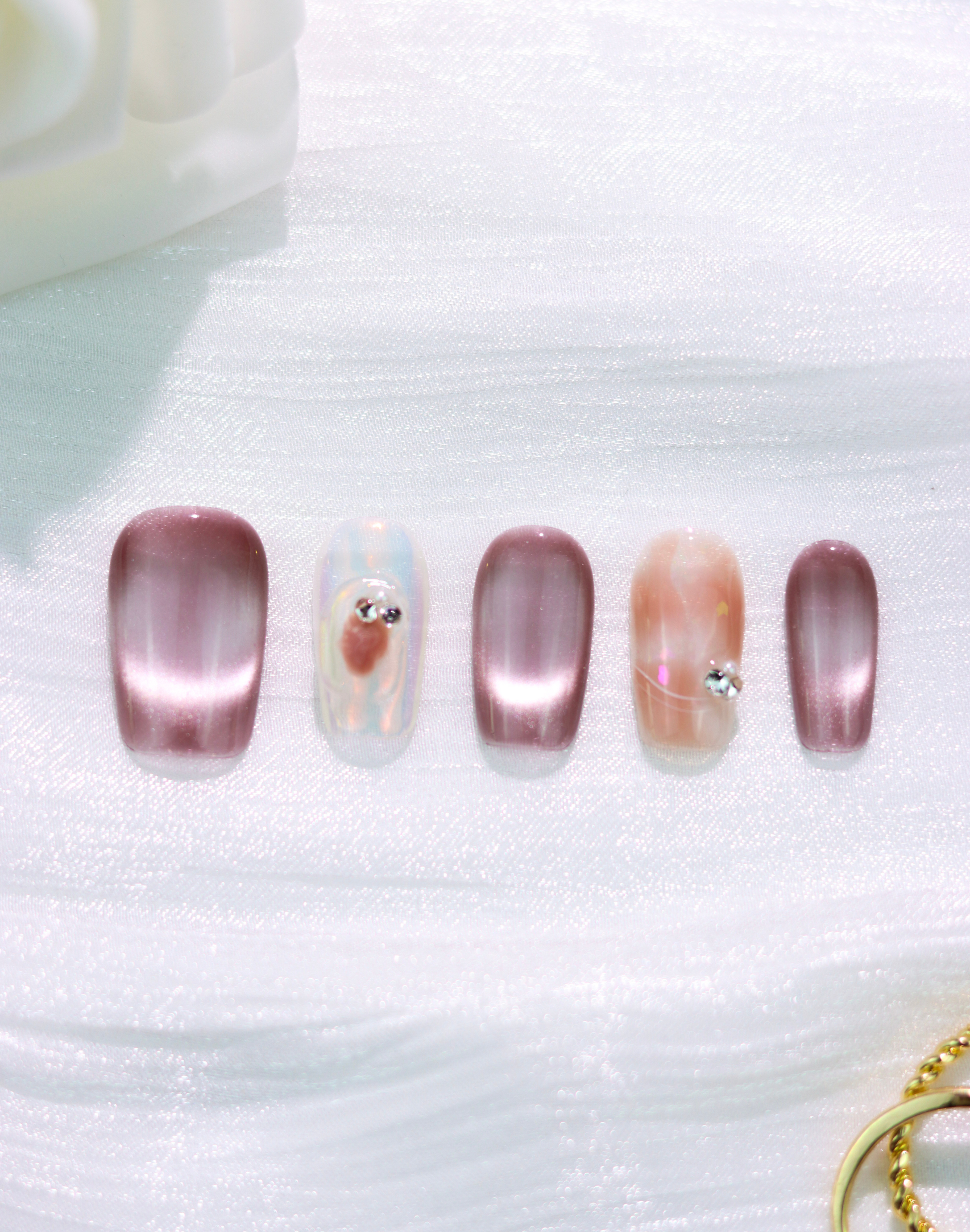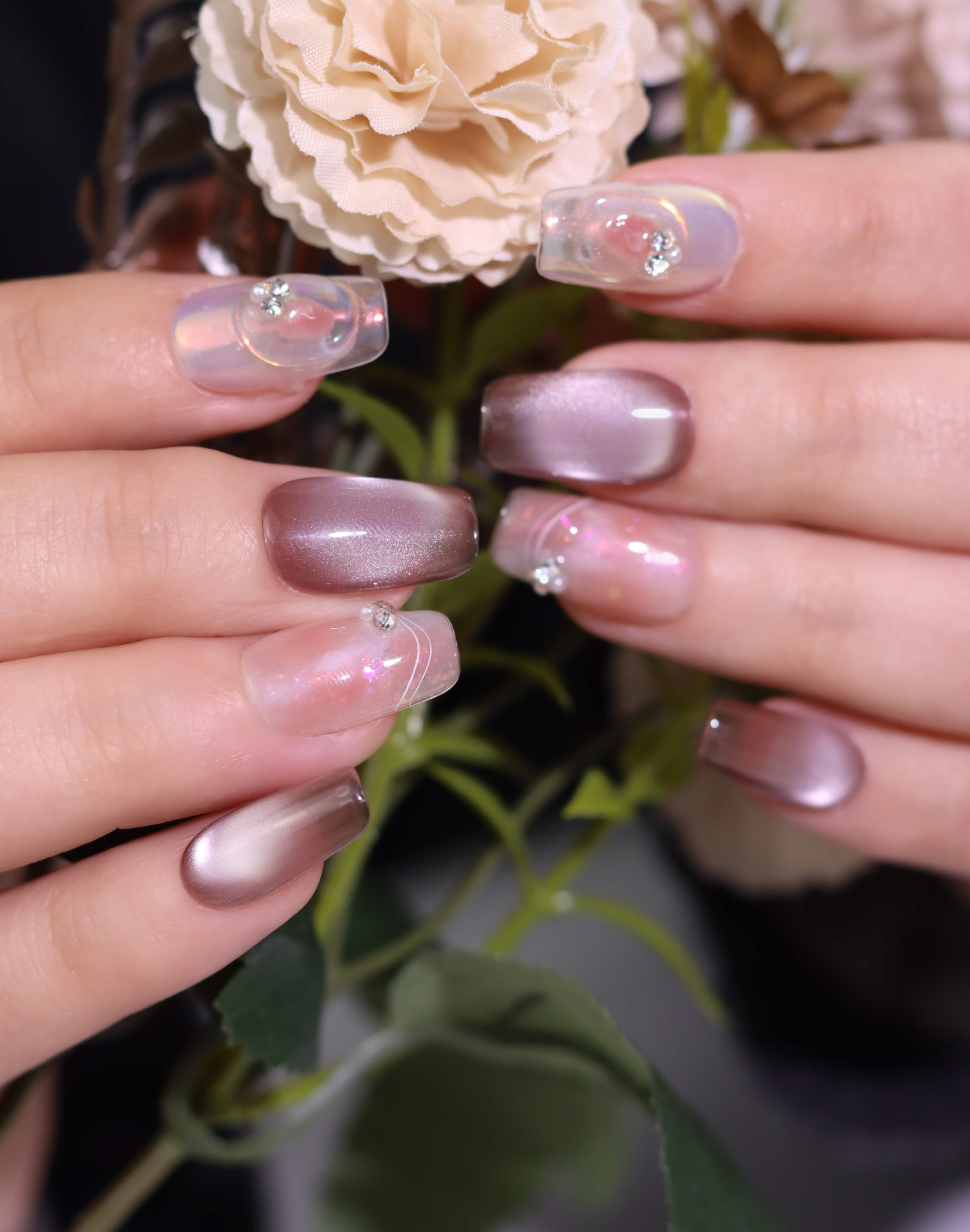 落ち着いたローズトーンが甘くなりすぎず、大人の女性らしい柔らかさを引き立てます。半透明の質感が指先を軽やかに見せ、重さのない仕上がりに。